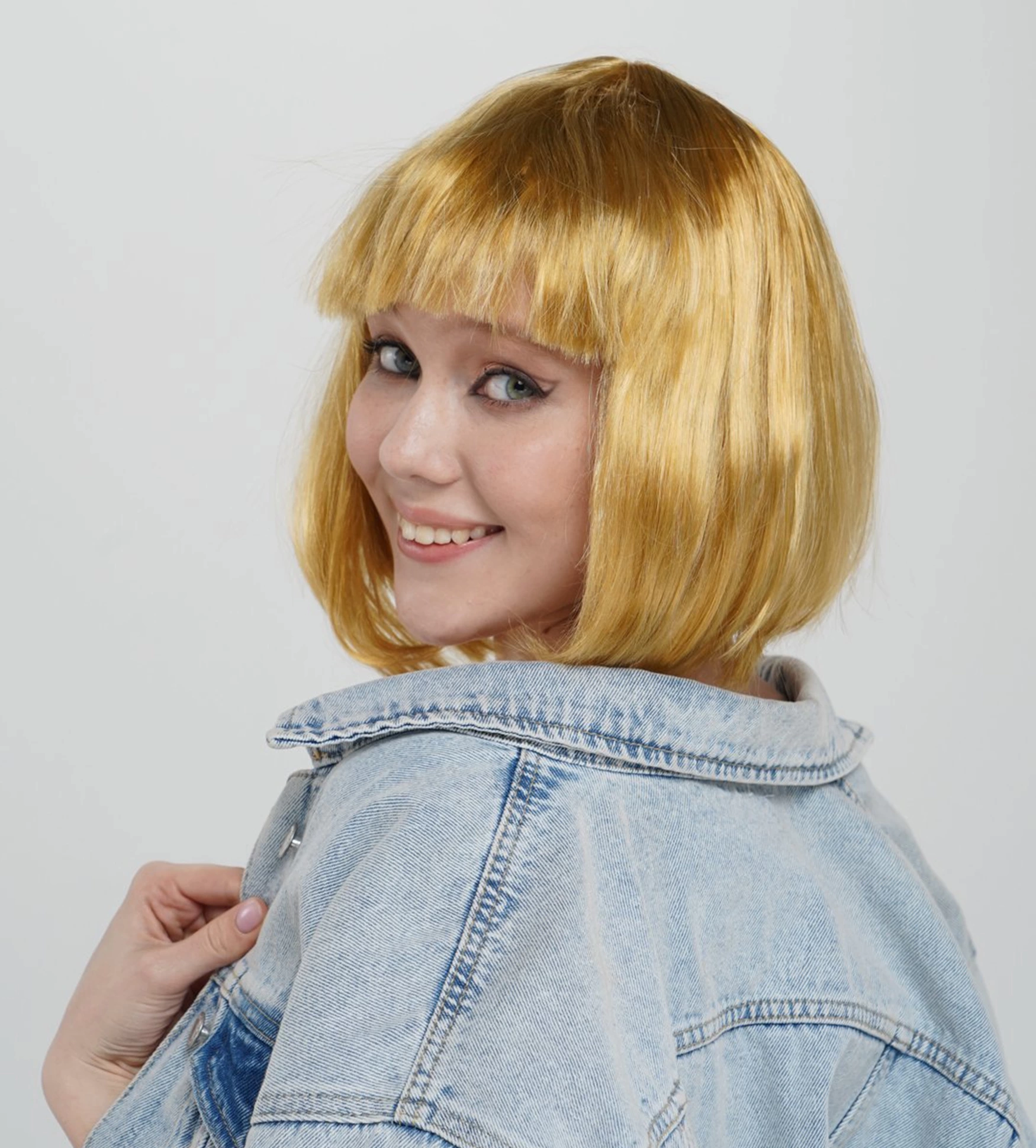 Bu peruk, canlı ve cesur altın rengi ile dikkat çekici bir görünüme sahiptir. Düz kesimi ve kısa oluşu ile modern ve şık bir tarz sunar.