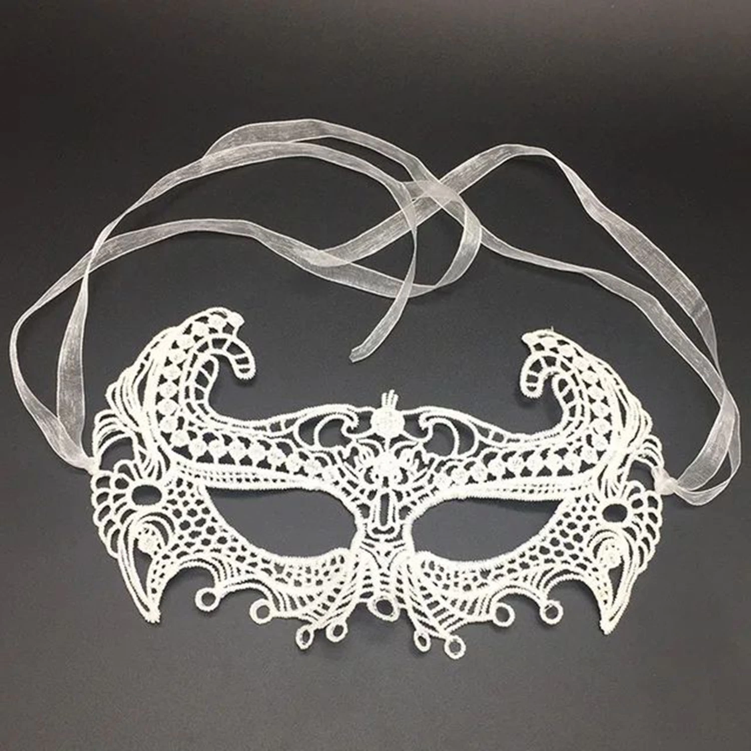 Beyaz Renk Dantel Kesim Dantel İşlemeli Balo Parti Maskesi, balo, parti veya özel bir gece için gizemli ve şık bir görünüm oluşturmak isteyenler için ideal bir üründür. Zarif dantel kesimi ve beyaz rengi ile göz alıcı bir stil sunar.
